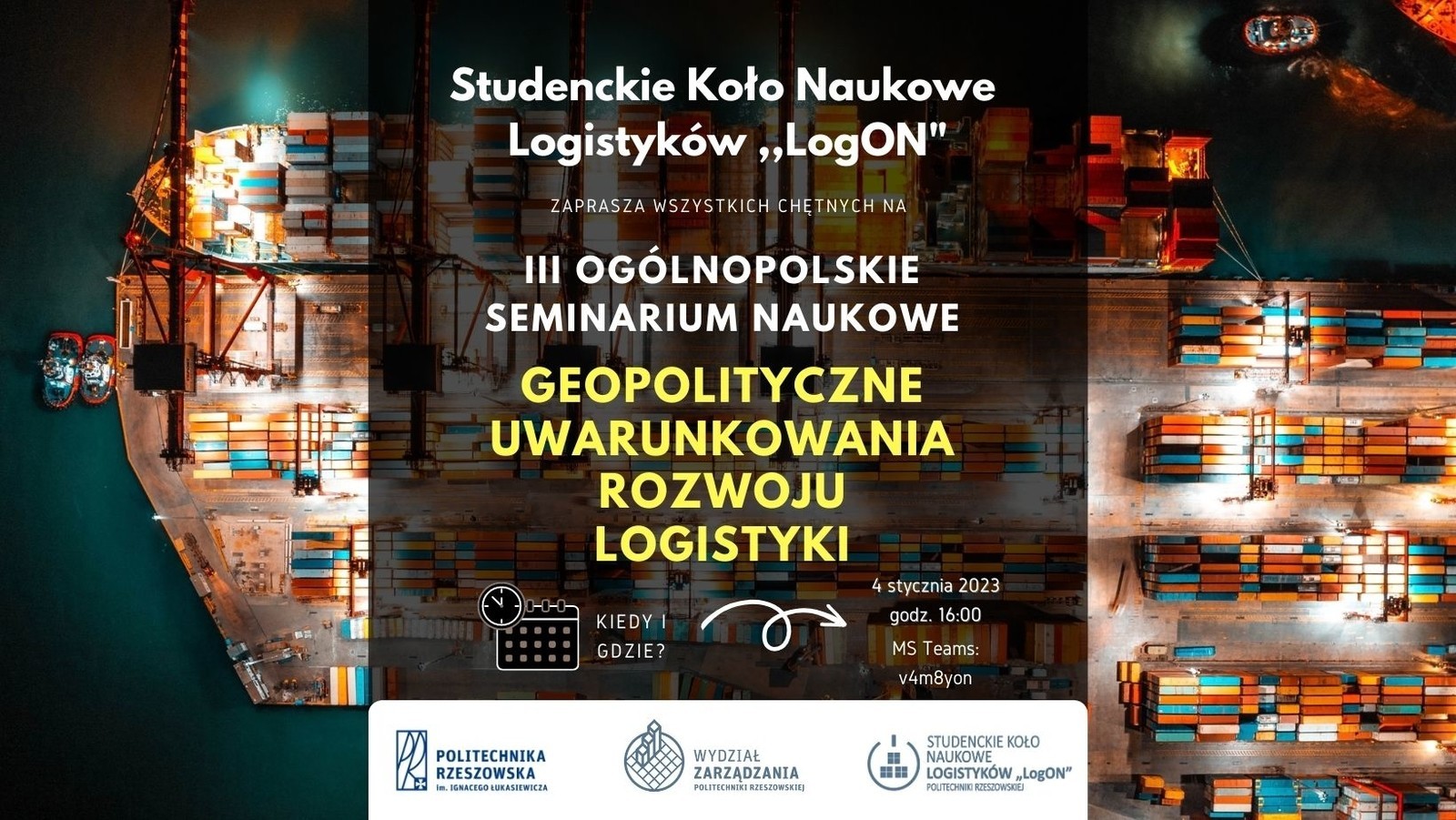 Studenckie Koło Naukowe Logistyków „LogON” funkcjonujące przy Zakładzie Systemów Zarządzania i Logistyki na Wydziale Zarządzania Politechniki Rzeszowskiej serdecznie zaprasza do udziału w III Ogólnopolskim Seminarium Naukowym "Geopolityczne uwarunkowania rozwoju logistyki". Wydarzenie odbędzie się 4 stycznia 2023 roku na platformie MS Teams w godzinach 16:00 – 18:00. Kod zespołu: v4m8yon.